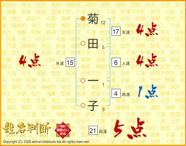 菊田一子さんの総運は21画の5点!