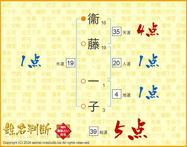 生活面を象徴する運勢です。外部から受ける影響力を表し、結婚運、家庭運や職場、環境への順応性を表します。総運から人運を引いた画数。姓や名が1文字の場合を除く。