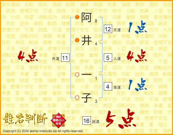 阿(8画)井(4画) 一(1画)子(3画)