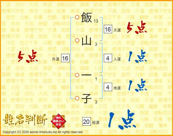 生活面を象徴する運勢です。外部から受ける影響力を表し、結婚運、家庭運や職場、環境への順応性を表します。総運から人運を引いた画数。姓や名が1文字の場合を除く。