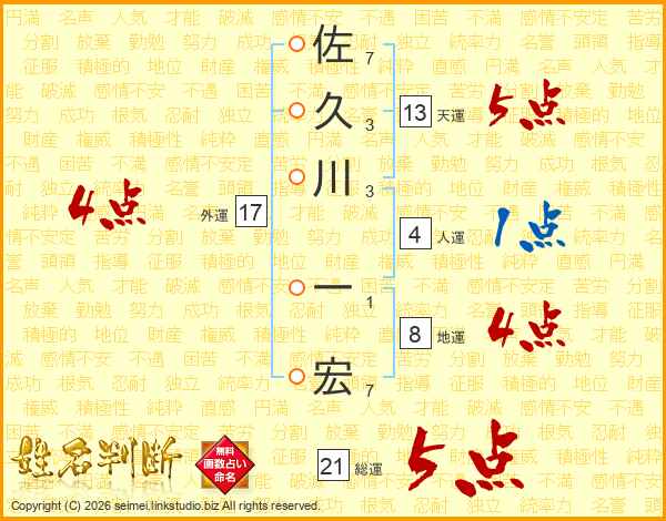 佐(7画)久(3画)川(3画) 一(1画)宏(7画)