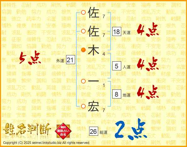 佐佐木一宏さんの総運は26画の2点!