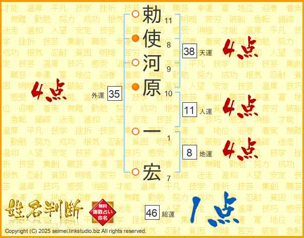 勅(11画)使(8画)河(9画)原(10画) 一(1画)宏(7画)