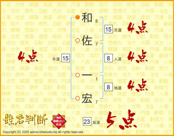 生活面を象徴する運勢です。外部から受ける影響力を表し、結婚運、家庭運や職場、環境への順応性を表します。総運から人運を引いた画数。姓や名が1文字の場合を除く。