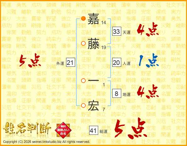 嘉藤一宏さんの総運は41画の5点!
