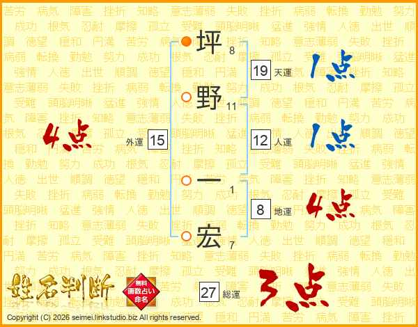 生活面を象徴する運勢です。外部から受ける影響力を表し、結婚運、家庭運や職場、環境への順応性を表します。総運から人運を引いた画数。姓や名が1文字の場合を除く。