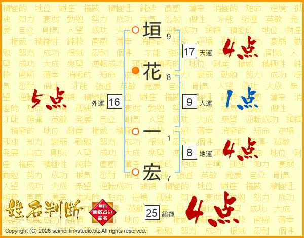垣(9画)花(8画) 一(1画)宏(7画)