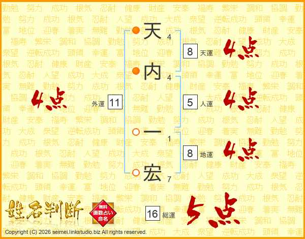 生活面を象徴する運勢です。外部から受ける影響力を表し、結婚運、家庭運や職場、環境への順応性を表します。総運から人運を引いた画数。姓や名が1文字の場合を除く。