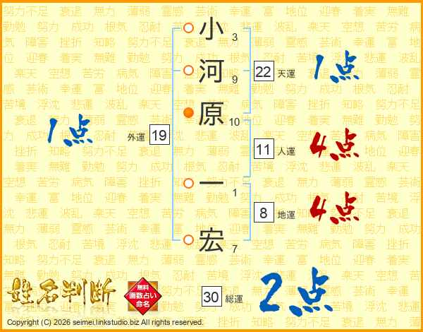 小河原一宏さんの総運は30画の2点!