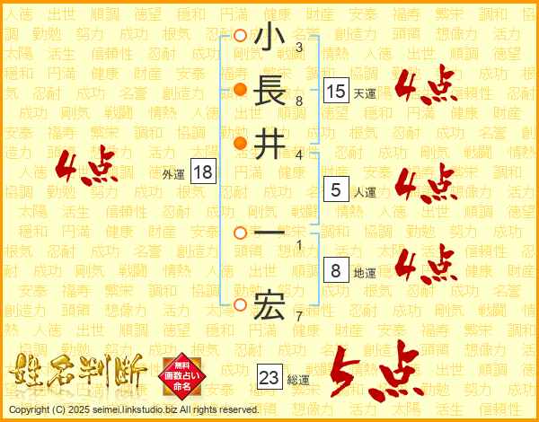 小(3画)長(8画)井(4画) 一(1画)宏(7画)