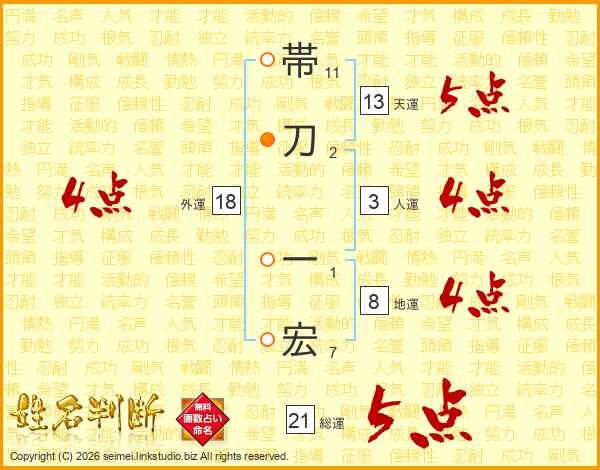 帯(11画)刀(2画) 一(1画)宏(7画)