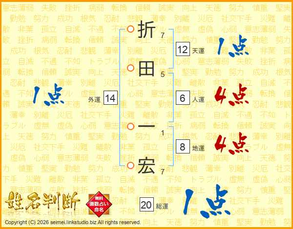 生活面を象徴する運勢です。外部から受ける影響力を表し、結婚運、家庭運や職場、環境への順応性を表します。総運から人運を引いた画数。姓や名が1文字の場合を除く。
