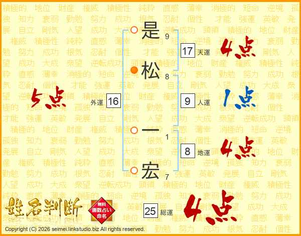 あなたの人生を表す1番重要な運勢です。生涯を通じて影響する総合運となり、主に50歳以降の晩年期に影響を及ぼします。苗字と名前の合計画数。