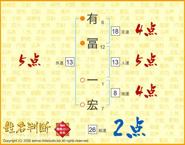 生活面を象徴する運勢です。外部から受ける影響力を表し、結婚運、家庭運や職場、環境への順応性を表します。総運から人運を引いた画数。姓や名が1文字の場合を除く。