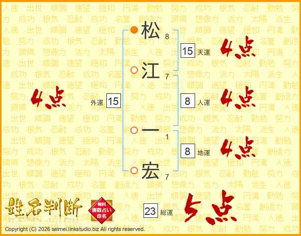 生活面を象徴する運勢です。外部から受ける影響力を表し、結婚運、家庭運や職場、環境への順応性を表します。総運から人運を引いた画数。姓や名が1文字の場合を除く。