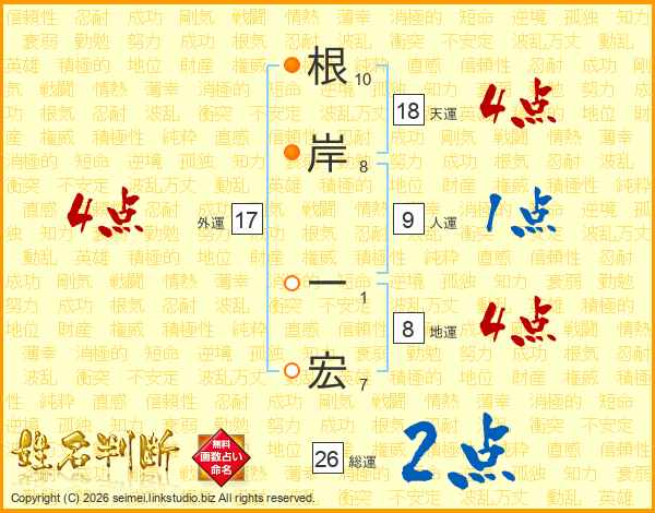 根(10画)岸(8画) 一(1画)宏(7画)