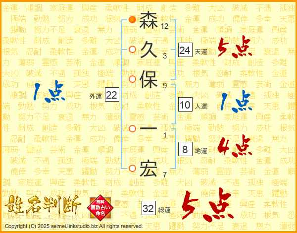 森(12画)久(3画)保(9画) 一(1画)宏(7画)
