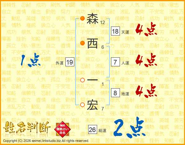 森(12画)西(6画) 一(1画)宏(7画)