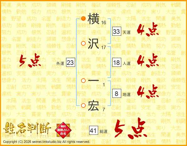 横沢一宏さんの総運は41画の5点!