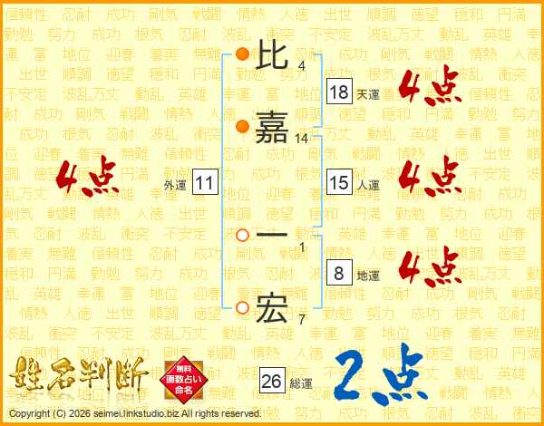 比(4画)嘉(14画) 一(1画)宏(7画)