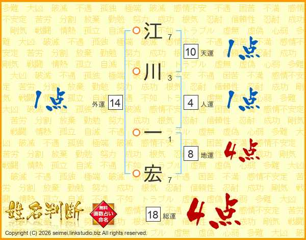 生活面を象徴する運勢です。外部から受ける影響力を表し、結婚運、家庭運や職場、環境への順応性を表します。総運から人運を引いた画数。姓や名が1文字の場合を除く。