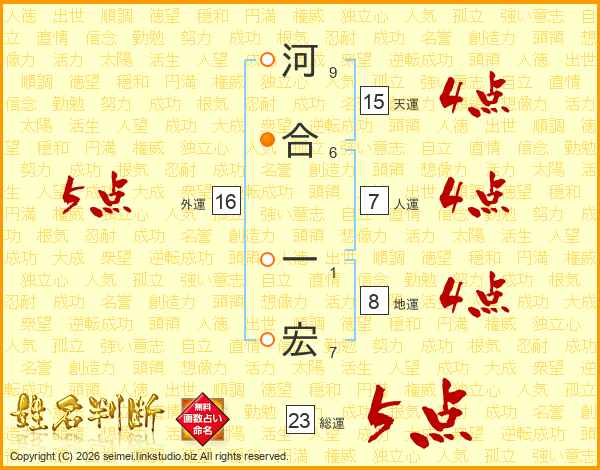 生活面を象徴する運勢です。外部から受ける影響力を表し、結婚運、家庭運や職場、環境への順応性を表します。総運から人運を引いた画数。姓や名が1文字の場合を除く。