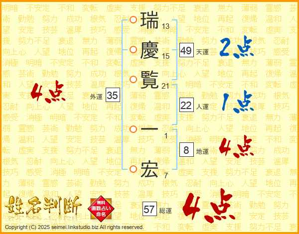 瑞(13画)慶(15画)覧(21画) 一(1画)宏(7画)
