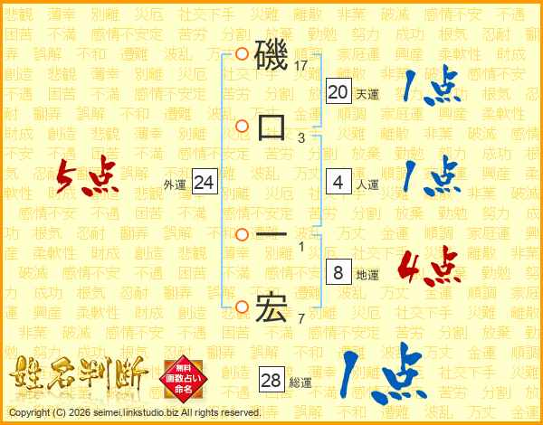 磯(17画)口(3画) 一(1画)宏(7画)