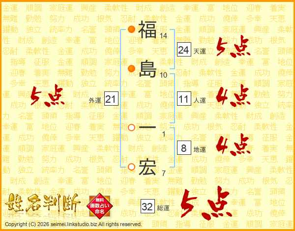 福(14画)島(10画) 一(1画)宏(7画)