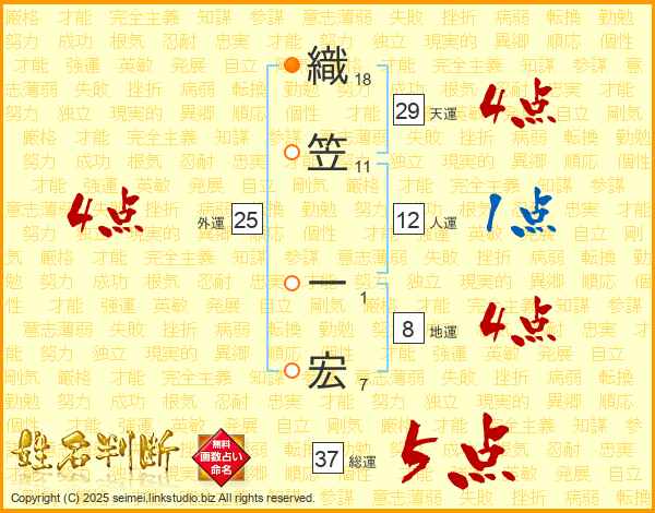 家系が持つ宿命的な運勢を表します。祖先から受け継いだ苗字ですので自分の力が及びません。家柄を象徴します。苗字の合計画数。