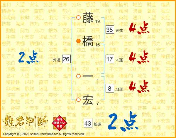 藤(19画)橋(16画) 一(1画)宏(7画)