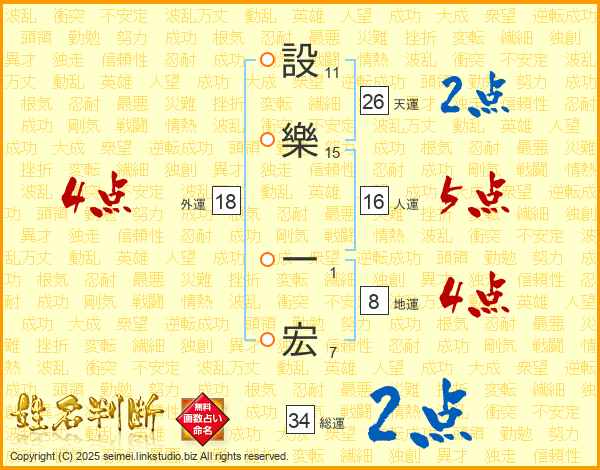 生活面を象徴する運勢です。外部から受ける影響力を表し、結婚運、家庭運や職場、環境への順応性を表します。総運から人運を引いた画数。姓や名が1文字の場合を除く。