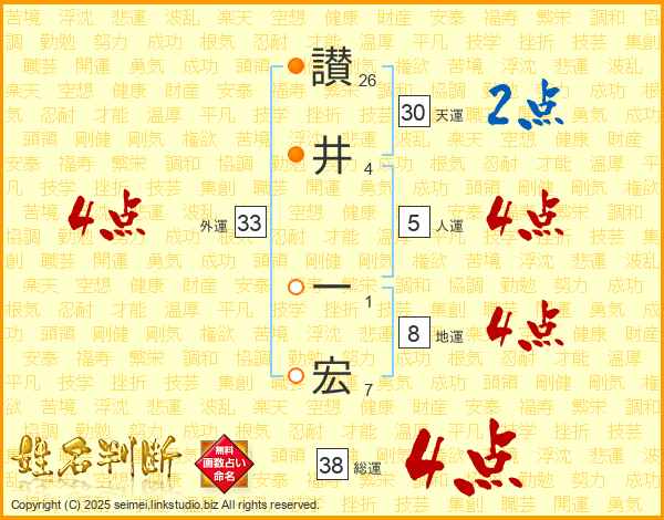 生活面を象徴する運勢です。外部から受ける影響力を表し、結婚運、家庭運や職場、環境への順応性を表します。総運から人運を引いた画数。姓や名が1文字の場合を除く。