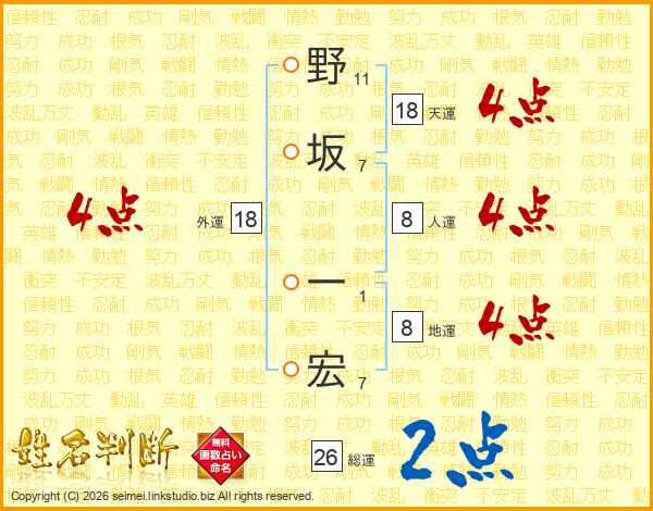 野坂一宏さんの総運は26画の2点!