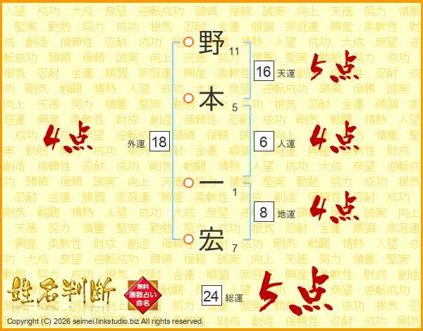 あなたの人生を表す1番重要な運勢です。生涯を通じて影響する総合運となり、主に50歳以降の晩年期に影響を及ぼします。苗字と名前の合計画数。