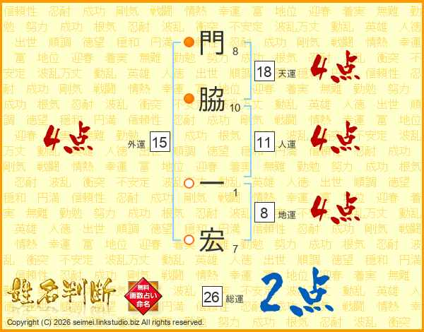 門(8画)脇(10画) 一(1画)宏(7画)