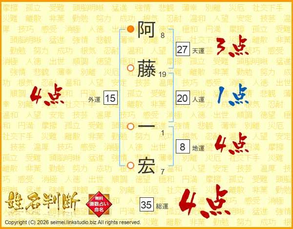 阿(8画)藤(19画) 一(1画)宏(7画)