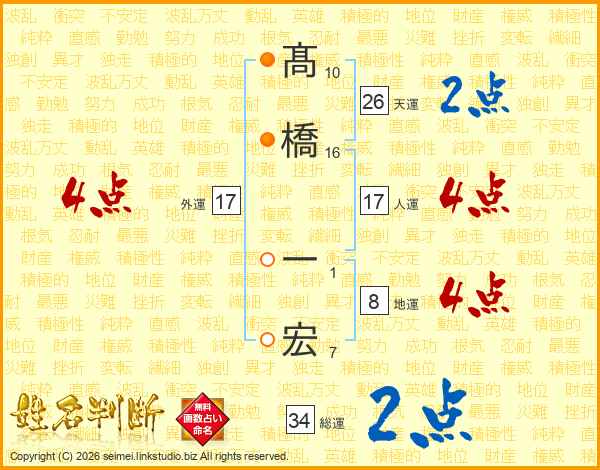 髙(10画)橋(16画) 一(1画)宏(7画)
