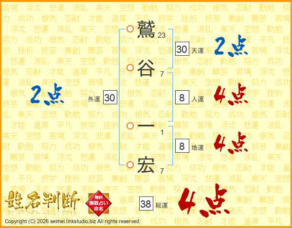 鷲谷一宏さんの総運は38画の4点!