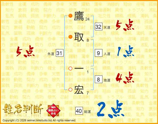 鷹取一宏さんの総運は40画の2点!