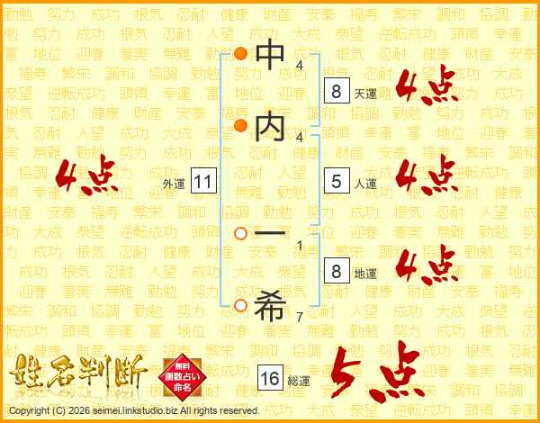 中内一希さんの総運は16画の5点!