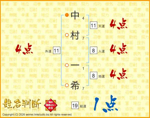 中(4画)村(7画) 一(1画)希(7画)