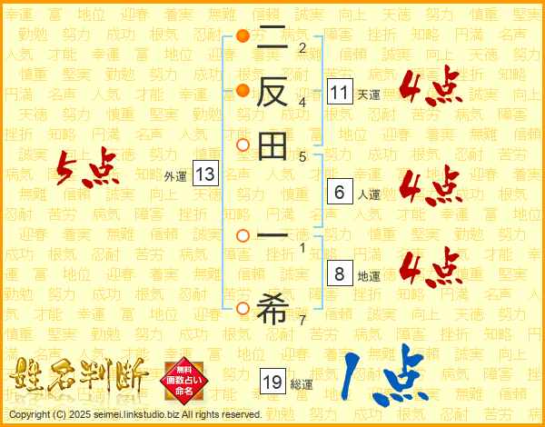画数の奇数(○陽)と偶数(●陰)の配列で吉凶を占います。どちらかにかたよる名前は大凶名で避ける必要があります。画数の奇数偶数。
