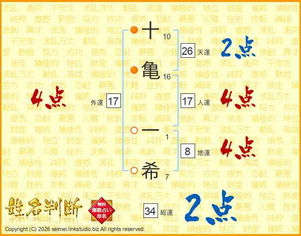 画数の奇数(○陽)と偶数(●陰)の配列で吉凶を占います。どちらかにかたよる名前は大凶名で避ける必要があります。画数の奇数偶数。