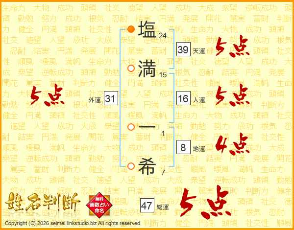あなたの人生を表す1番重要な運勢です。生涯を通じて影響する総合運となり、主に50歳以降の晩年期に影響を及ぼします。苗字と名前の合計画数。
