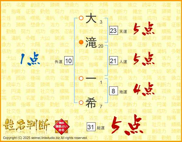 生活面を象徴する運勢です。外部から受ける影響力を表し、結婚運、家庭運や職場、環境への順応性を表します。総運から人運を引いた画数。姓や名が1文字の場合を除く。