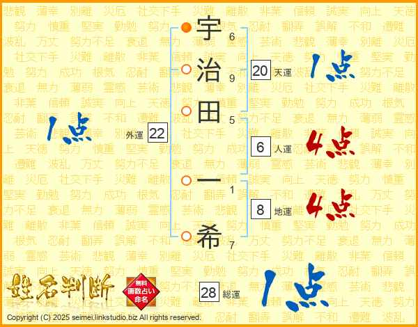 宇(6画)治(9画)田(5画) 一(1画)希(7画)