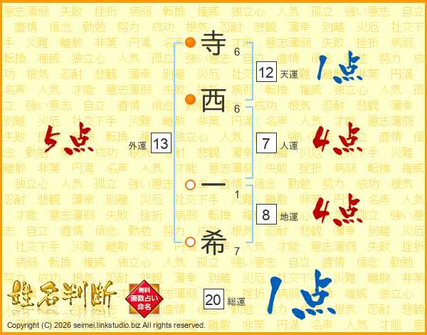 生活面を象徴する運勢です。外部から受ける影響力を表し、結婚運、家庭運や職場、環境への順応性を表します。総運から人運を引いた画数。姓や名が1文字の場合を除く。