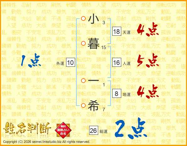 あなたの人生を表す1番重要な運勢です。生涯を通じて影響する総合運となり、主に50歳以降の晩年期に影響を及ぼします。苗字と名前の合計画数。