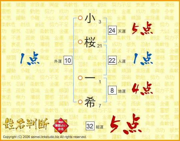 小桜一希さんの総運は32画の5点!